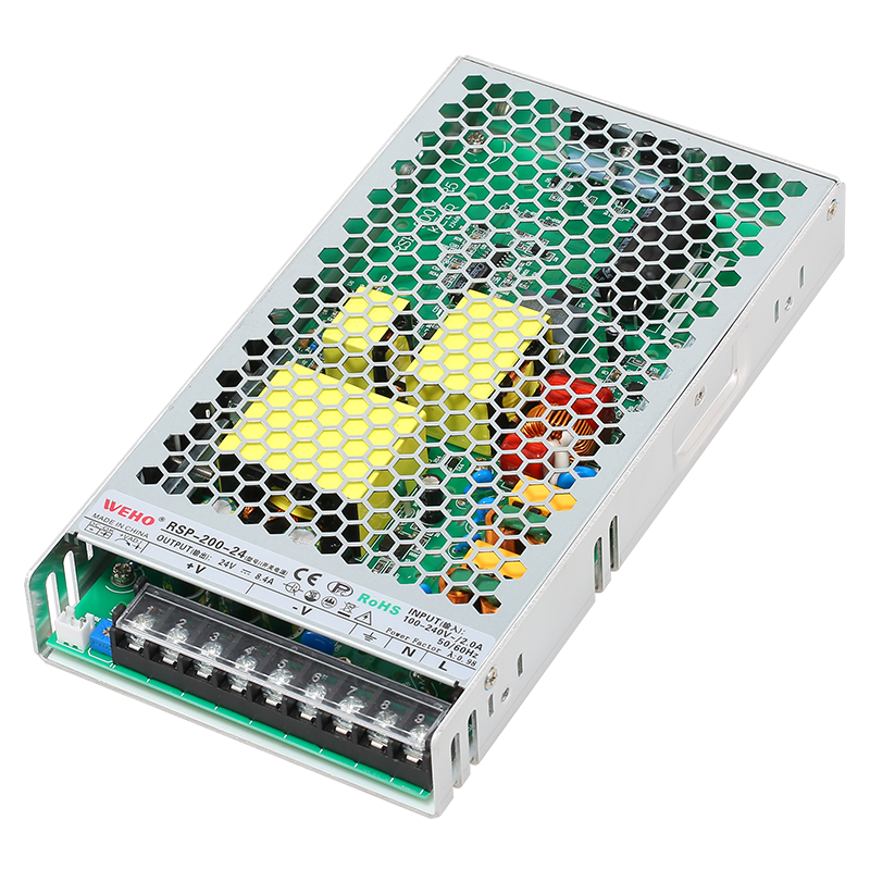 The WEHO RSP-200W is a 200W single-output enclosed power supply that delivers high efficiency up to 94%. It features a universal AC input range of 90-264VAC and a DC input range of 135-370VDC, with a high power factor (PF > 0.95 at 230VAC). This series is available in 12V, 24V, 36V, and 48V output models. Housed in a compact 159 x 97 x 30mm frame, it operates effectively in temperatures from -20°C to +60°C. Comprehensive protection against overload, overvoltage, and over-temperature ensures reliable and safe operation, making it ideal for various industrial applications.